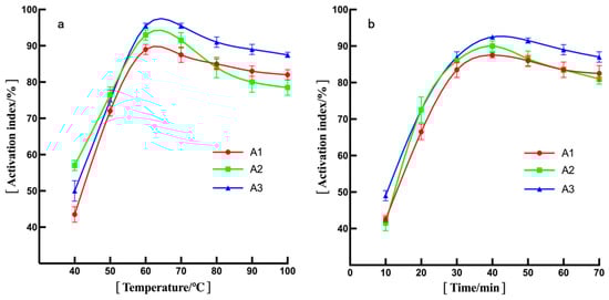 Relationship between activation index of modified titania nanoparticles and (a) temperature and (b) time.