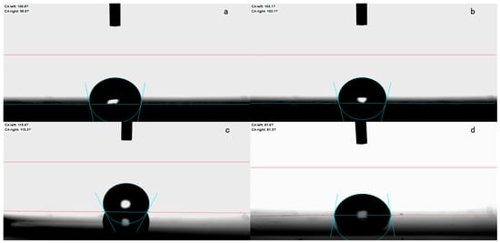 Water droplets on the surface of different waterborne coatings: (a) B1; (b) B2; (c) B3 and (d) B4.