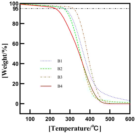The thermal decomposition behaviors of the different waterborne nanoscale titania coatings were studied using thermogravimetric analysis. The sample was heated at 10 °C/min under nitrogen flow, and the TGA curves are shown in Figure 6. It can be seen that the quality of waterborne coatings (B1, B2, B3 and B4) starts to decrease obviously at 273.3 °C, 268.1 °C, 317.2 °C and 225.6 °C, respectively. Therefore, methacryloxy silane-modified nanoscale titania is most suitable for high-temperature-resistant coatings. This phenomenon is attributed to the bonding of modified nanoscale titania with waterborne solvent molecules in the coating. The silane coupling agent binds the titania nanoparticles and the acrylic molecules together by chemical bonds so that they can be dispersed more evenly in the coating. The molecules in the coating form an infinite number of connected heat conduction channels that, when heated locally, could quickly transfer heat to other parts of the coating. Therefore, modified titania nanoparticles in the coating could improve the heat resistance of the waterborne coating [].