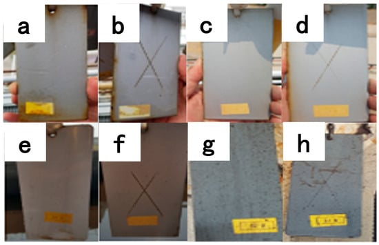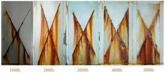 The aforementioned coating (B3) was also tested on coupons suspended in different locations of a coastal thermal power plant in China, including a boiler, an open drain, a water treatment station and a coal bunker. The size of the coating samples was 150 mm × 70 mm, with X scratches and no scratches, and they were kept at a distance of 50 mm to ensure that they were completely exposed to a corrosive environment and sunlight.