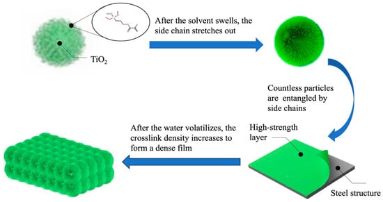 The mechanism by which the modified spherical titania nanoparticles formed a high-strength resin coating is illustrated in Figure 9. The side chains of the modified nano-titania extend, and the resin molecules are grafted onto the surface of the spherical particles, forming fluffy particles with numerous side chains []. Countless particles were intertwined by side chains, forming a dense and corrosion-resistant coating. The three-dimensional network structure formed by the ultrahigh molecular weight rapidly disperses the local stress between the networks, greatly reducing the damage to the coating caused by the stress. The titania nanoparticle connected one end of the silane coupling agent molecule, whose other end connected the acrylic molecule in the waterborne solvent. Therefore, a large number of long side chains on the titania nanoparticle formed, which exhibited good elasticity. These free elastic side chains ensured the full flexibility of the coating, greatly extending the protection life of the film.