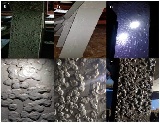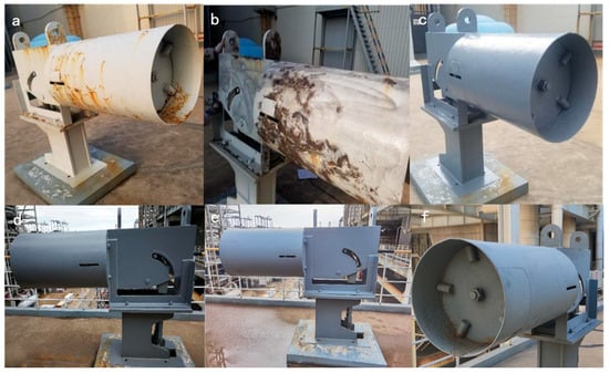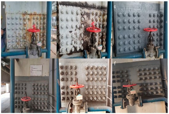 Coatings above boiler connecting bolts: (a) original condition; (b) after rust removal; (c) until 2018; (d) until 2021; (e) until 2022 and (f) until 2023.