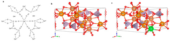 The molecular structure of HAp (a) and the crystalline structures of HAp (b) and HApSr with Sr substitution at Ca1 site (c); oxygen with red and hydrogen with pink.