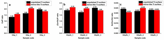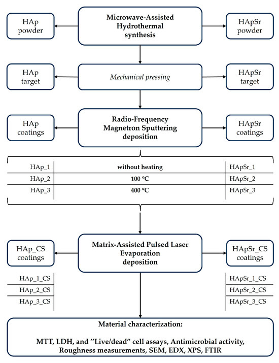 The HAp and HApSr layers were deposited on Ti substrates (heated from room temperature—25 °C to 100 °C and 400 °C) using the RF-MS technique. The magnetron plasma source was purchased from K.J. Lesker Company (Jefferson Hills, PA, USA). The deposition parameters and the experimental setup were reported in [44] and [18], respectively. The layer thicknesses were around 300 nm [44]. The samples codes, based on the substrate temperature and Sr content, are presented in Figure 2.