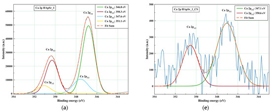 The deconvoluted high-resolution XPS spectra of HAp_1_CS and HApSr_1_CS samples are presented in Figure S2 and Figure 3, respectively. For the HAp_1_CS (Figure S2e) and HApSr_1_CS (Figure 3e) coatings, the XPS peaks corresponding to Ca 2p3/2 (see Table 2), 347 eV and 347.1 eV, respectively, were assigned to Ca-Ca, Ca-OH, Ca-O, in HAp [20,54].