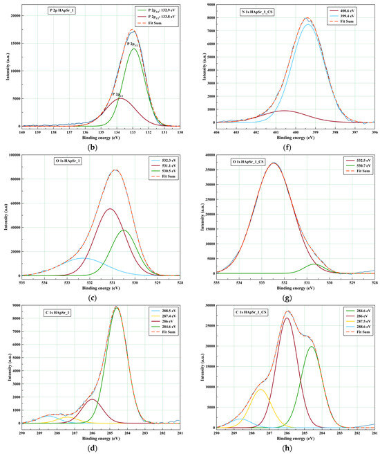 For the N1s spectra of HAp_CS_1 (see Figure S2f) and HApSr_CS_1 (see Figure 3f), two peaks were identified at 400.4 eV and 399.3 eV and 400.6 eV and 399.4 eV, respectively, corresponding to C-NH2 and C–NH–C=O binding energies.