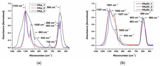 For the HApSr coatings (Figure 4b), three absorption bands were identified in the FTIR spectra in the 1300–800 cm−1 wavenumber range, namely 1082 cm−1 (HApSr_1), 1091 cm−1 (HApSr_2), 1107 cm−1 (HApSr_3), and ~1027 cm−1 (HApSr_1 and HApSr_3), characteristic of the asymmetric stretching mode of P-O (ν3) [69]; at 943 cm−1, characteristic of the symmetric stretching mode of P-O (ν1) [69]. Li [69] previously reported that the Sr doping of HAp structure can lead to shifts of the 963 cm−1 IR band to 943 cm−1.