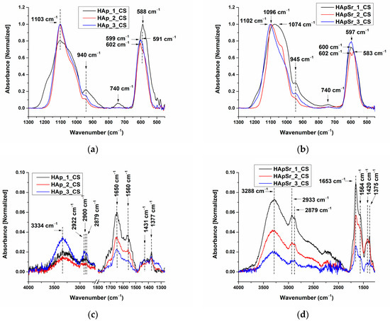 The FTIR spectra of HAp_CS and HApSr_CS coatings deposited on Ti substrates with optically polished surfaces 1300–450 cm−1 and 4000–1300 cm−1 wavenumber ranges are presented in Figure 5a,b and Figure 5c,d, respectively.