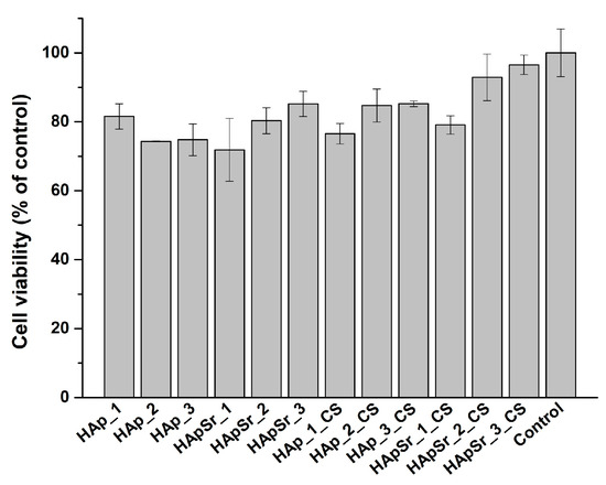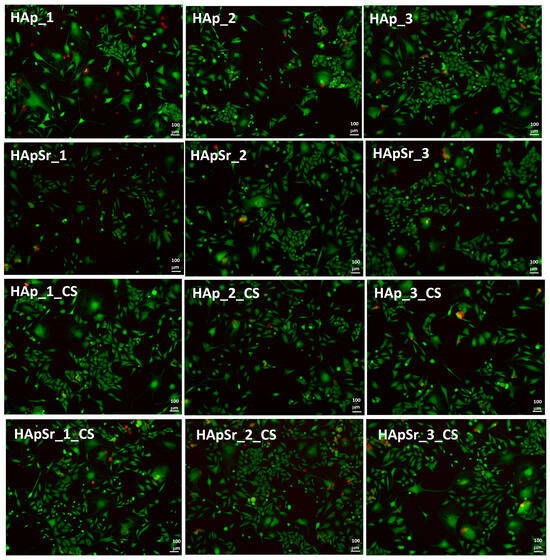 The following supporting information can be downloaded at: https://www.mdpi.com/article/10.3390/polym16131922/s1, Figure S1: XPS survey spectra of HAp and HApSr coatings; Figure S2: XPS high-resolution deconvoluted spectra of HAp_1: (a) Ca 2p, (b) P 2p, (c) O 1s, and (d) C 1s and HAp_1_CS: (e) Ca 2p, (f) N 1s, (g) O 1s, and (h) C 1s; Figure S3: XPS survey spectra of HAp_CS and HApSr_CS coatings; Figure S4: FTIR spectra of the HAp (a) and HApSr (b) powders obtained by Microwave-assisted Hydrothermal synthesis in the wavenumber range 1350–450 cm−1; Figure S5: SEM images of HAp_2 (a and b) and HApSr_2 (c and d) coatings deposited on mirror-like (a and c) and unpolished Ti (b and d) samples at a substrate temperature of 100 °C; Figure S6: SEM images of HAp_2_CS (a and b) and HApSr_2_CS (c and d) coatings deposited on mirror-like (a and c) and unpolished Ti (b and d) samples at a substrate temperature of 100 °C; Figure S7: Fluorescence microscopy image of “Live/Dead” cell assay of L929 cells—control, standard conditions.