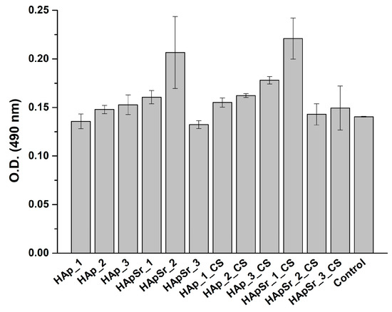 The area percentages for the peak characteristic to C-OH; C-O-C/C-N (286 eV) (see Table 2) ranged between 43 to 46% for all chitosan containing coatings (HAp_CS and HApSr_CS), while for the coatings without chitosan (HAp and HApSr) for the peaks characteristic to C-OH; C-O-C (286 eV) (see Table 1), the area percentages were below 23% for all samples.