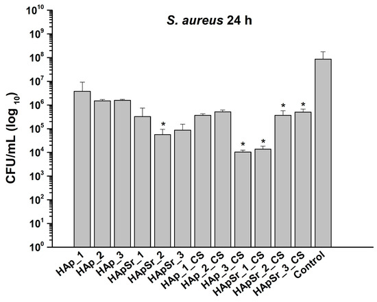 From an overnight culture of S. aureus ATCC strain, a fresh inoculum was prepared and incubated at 37 °C with shaking until a mid-exponential phase was obtained (108 CFU mL−1). The bacterial suspension was diluted to reach a bacterial concentration of 106 CFU mL−1. The bacterial suspension was placed into 5 mL screw-cap test tubes and incubated in the presence of the materials in a final volume of 2 mL at 37 °C with shaking. S. aureus ATCC was counted by taking 50 µL aliquots after 24 h of incubation making serial dilutions, and plating on plate count agar.