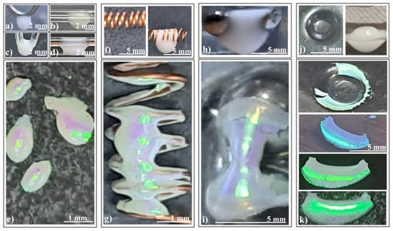 - Sandu, I.; Antohe, I.; Fleaca, C.T.; Dumitrache, F.; Urzica, I.; Brajnicov, S.; Iagaru, R.; Sava, B.A.; Dumitru, M. Shaping in the Third Direction: Self-Assembly of Convex Colloidal Photonic Crystals on an Optical Fiber Tip by Hanging Drop Method. Polymers 2024, 16, 33. [Google Scholar] [CrossRef]