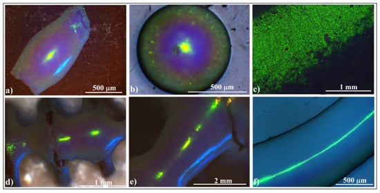 We observed that the self-assembly phenomenon is independent of sphere nature and size. Both types of colloidal crystals exhibited high-quality surfaces. Notably, we observed no cracks at either the micro- or macroscopic level (except those caused by handling errors). However, upon closer examination of a handling-induced crack (Figure 3d), we confirmed higher ordering of the colloidal crystal on its cross-section, particularly near its surface (Figure 3g). Unfortunately, despite the good quality of the external surface of the colloidal crystals, their interface with the fiber exhibited poor optical quality and UV–Vis spectroscopy response. Interestingly, this seems to be a common characteristic of self-assembled colloidal crystals using the hanging-drop method. However, in a recent article, we demonstrated how the quality of this interface could be improved when intentionally seeking higher quality [39].