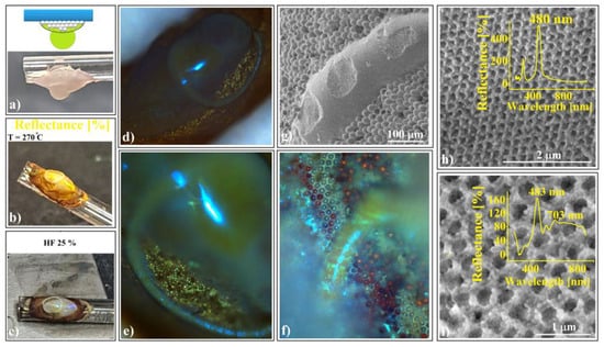 The UV–Vis spectra of the two differently shaped structures exhibit striking similarities (as shown in Figure 8h,i). These spectra reveal a prominent and narrow reflection band centered around 485 nm, along with a secondary, lower band at 290 nm. Remarkably, both reflection bands closely align with calculated values based on Bragg’s law, considering a polystyrene refractive index of n = 1.59 and a hole size of 264 nm (corresponding to (111) family planes and superposition of other reflection bands, respectively).