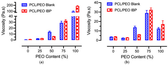 Average viscosities of the blank and IBP-loaded PCL/PEO solutions: (a) 10 wt% polymer concentrations for all PCL/PEO blends; (b) 30 wt% polymer concentrations for PCL/PEO (100/0) blends, 8 wt% polymer concentration for PCL/PEO (0/100) blends, and 10 wt% polymer concentrations for the remaining PCL/PEO blends, using the same average viscosity data as in (a) for plotting.