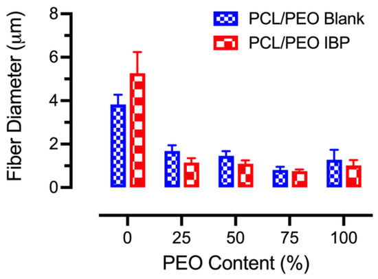 The average fiber diameters of the blank and IBP-loaded PCL/PEO blend fibers at various concentrations are shown in Figure 3. The average fiber diameters for the 30% PCL/PEO (100/0) fibers were 3.83 ± 0.44 μm and 5.26 ± 0.98 μm for the blank and IBP-loaded fibers, respectively. In contrast, the average fiber diameters for the 8% PCL/PEO (0/100) fibers were 1.28 ± 0.45 μm and 1.02 ± 0.25 μm for the blank and IBP-loaded fibers, respectively. The average fiber diameters of the 10% blend PCL/PEO fibers (i.e., 75/25, 50/50, and 25/75) decreased with increasing PEO contents. The incorporation of the IBP in the 10% blend PCL/PEO fibers slightly decreased the average fiber diameters as compared to their counterparts, except in the 100/0 formulation.