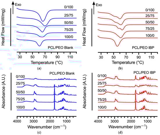 Differential scanning thermograms and Fourier transform infrared spectra of electrospun PCL/PEO blend fibers at various compositions: (a) DSC thermograms of blank PCL/PEO fibers; (b) DSC thermograms of IBP-loaded PCL/PEO fibers; (c) FTIR spectra of blank PCL/PEO fibers; (d) FTIR spectra of IBP-loaded PCL/PEO fibers.