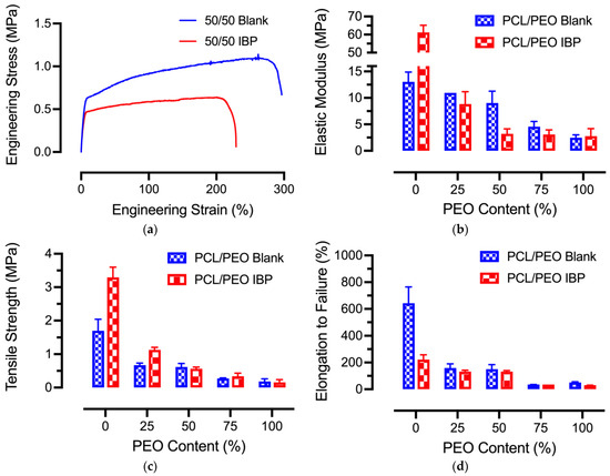 Mechanical properties of electrospun PCL/PEO blend fibers at various compositions: (a) Representative stress–strain curves for blank and IBP-loaded PCL/PEO (50/50) fibers; (b) Average elastic moduli; (c) Average tensile strength; (d) Average elongation to failure for the various blend PCL/PEO fibers.