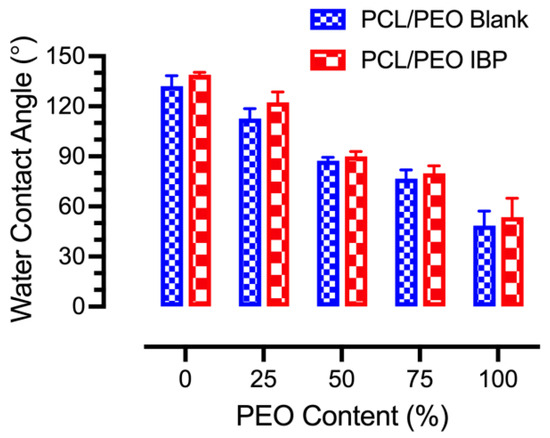 Surface wettability of the blank and IBP-loaded PCL/PEO fibers were measured using the water contact angle method, and the results are shown in Figure 6. The average water contact angles of the blank PCL/PEO fibers decreased from 132.14° ± 6.12° to 48.57° ± 8.65° when increasing the PEO content. In addition, the average water contact angles of the IBP-loaded PCL/PEO fibers decreased from 138.95° ± 1.38° to 53.61° ± 11.36° when increasing the PEO content. The decrease in the average water contact angles in various compositions of the blend PCL/PEO fibers was associated with the incorporation of water-soluble PEO. Moreover, incorporating IBP in the PEL/PEO blend fibers enhanced the surface hydrophobicity, due to the lipophilic nature of the IBP.
