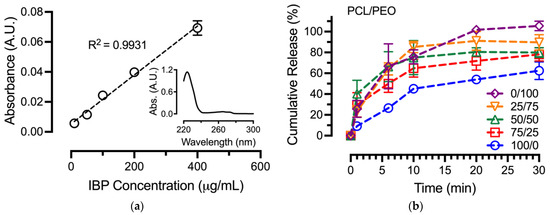 The in vitro release of IBP from blend PCL/PEO fibers in the sink condition was performed to correlate various fiber formulations on IBP releases, and the results are shown in Figure 6. Prior to setting up the in vitro release assay, an IBP standard curve was established in a PBS/DMSO (1/1) mixture using the serial dilution method, as shown in Figure 7a. The use of a PBS/DMSO mixture as the solvent was due to the limited solubility of IBP crystals in PBS and/or DI-water. The R2 correlation from the linear regression was 0.9931 for the IBP standard curve. In addition, the Figure 7a inset shows a representative UV–vis spectrum of IBP in PBS/DMSO (1/1), with characteristic peaks at 225 nm and 265 nm associated with π → π* transition of the aromatic ring in IBP’s molecular structure [23].