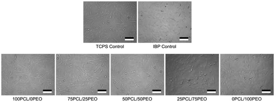 MEF-3T3 cellular morphologies after 48 h of culture in various media, including tissue culture polystyrene (TCPS) plate controls with standard cell culture media, IBP controls with 10% dilution of saturated IBP in standard cell culture media, and various experimental groups of 10% dilution of the release media from PCL/PEO blend fibers in standard cell culture media. Scale bar = 100 μm.