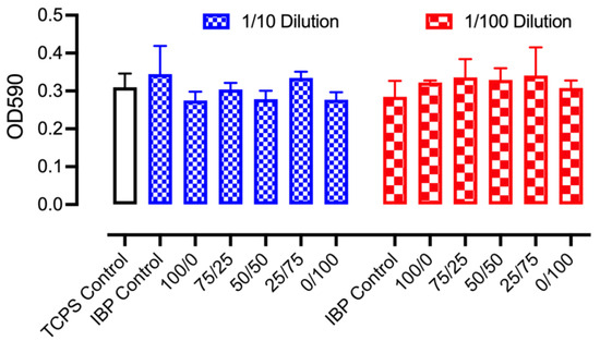 The MEF-3T3 viability assays were carried out in accordance with previous studies [16]. Briefly, tissue culture polystyrene (TCPS) plate control groups were supplemented with standard culture media, whereas the IBP control groups included mixtures of 10% and 1% dilutions of the saturated IBP solutions (i.e., 21 μg/mL [17]) with the standard culture media, respectively. For the experimental groups, the in vitro release media, collected from various IBP-loaded PCL/PEO fiber vials after 48 h, were diluted to 10% and 1% in culture media prior to MTT assays. After the incubation of the cells with the MTT reagent, a 100 μL warm detergent solution was then added to each well to lyse the cells and solubilize the colored crystals for the collection of the supernatants. The supernatants were then transferred to a 96-well plate for optical measurements using a TECAN Infinite® 200 Pro M Plex microplate reader (Männedorf, Switzerland) at 590 nm absorbance. All experiments were performed in triplicate (n = 3), and the results were expressed as relative cell viability ratio compared to the control groups.