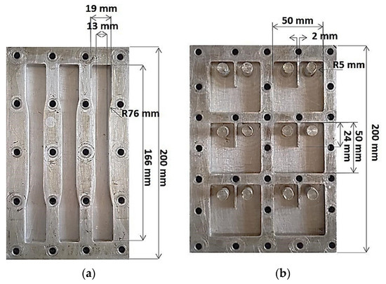 To evaluate the static mechanical properties of the produced composites, tensile testing and compact tension testing methods were employed. Mechanical tensile testing was conducted, utilizing a universal testing machine (UTM) equipped with a 100 kN load cell, operating at a loading speed of 1 mm/min using ASTM D638 standard test procedure. A laser extensometer was used to measure the strain. The aluminum mold used for preparing the tensile specimens had a gauge length of approximately 50 mm and a cross-sectional area of 13 × 7 mm2 (see Figure 1a). From each batch, at least 5 samples were tested and analyzed [20]. The elastic modulus and the stress at failure were key parameters analyzed from the test results.