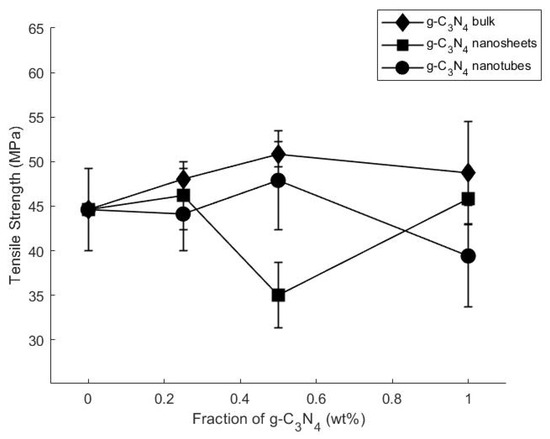 The average tensile strength of g-C3N4-reinforced epoxy composites plotted against filler concentration (wt.%).