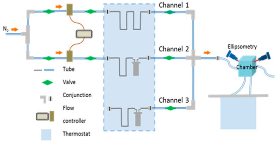 Solvent annealing was performed in a custom-made setup (Figure 1). Nitrogen, as a carrier gas, passes through two flow controllers (MKS 647C, MKS Instruments Deutschland GmbH, München, Germany) connected to the channel with a flow of pure nitrogen (Channel 1) and to the channel that delivers solvent vapor (Channel 2) into the chamber. Flow controllers define the total flow through a channel (a maximum value of 100 sccm, unless otherwise specified), as well as the partial vapor pressure in the chamber p/p0. The latter is adjusted by mixing the flows through Channel 1 and Channel 2. The temperature of the vapor Tv was maintained by a bath thermostat with immersed vials with the solvent. The temperature of the substrate Ts was adjusted by cycling water through the tubing at the bottom of the chamber. Further details can be found in Ref [28].