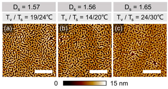Shown in Figure 2a–c are topographic SFM images of PS-PVP films with an initially dry thickness of ~ 42 nm, well below the intrinsic domain spacing L0 = 117 nm, which were annealed for 10 min at different temperature sets Tv/Ts with an intended ΔT = Ts − Tv difference of 5–6 °C. The desired precision in the targeted degree of swelling Ds was not feasible to achieve in different comparative experiments, since multiple dynamic and thermodynamic parameters affect the solvent uptake. However, we believe that the slight deviations in the annealing conditions can be tolerated for interpreting the developed structures.