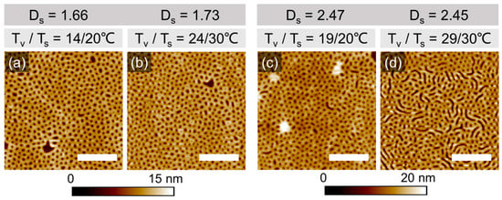SFM topography images of PS-PVP films with hdry= 42 ± 2 nm annealed under Tv/Ts of (a) 14/20 °C, (b)24/30 °C, (c) 19/20 °C, and (d) 29/30 °C with 100% p/p0 of chloroform vapor for 200 min. The corresponding Ds are located at the top of each image. hsw are ~70 nm and ~102 nm for Ds ~1.7 and ~2.5, respectively. The white scale bar in each image corresponds to 1 μm. Evaluated domain spacings are shown in Table 1 (Figures S4 and S5, Supplemental Information).