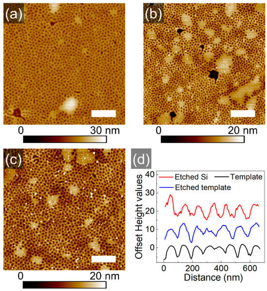SFM topography images of the block copolymer template (a), of the etched sample (b) and of the transferred pattern (c). The scale bar is 1 μm. (d) Cross-sectional profiles of the samples, as indicated.