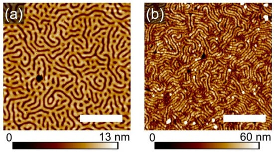 The structure in Figure 4d can be characterized as a coexistence of the PL and stripes of the vertically oriented lamella phase. This can be explained as an adjustment of the PL phase to a slight excess of the film thickness [63]. Further characteristic defects of the patterns in Figure 4 can be explained along the lines of the thickness-dependent morphological behavior, which will be reported in detail elsewhere (Figure S6, Supplemental Information).