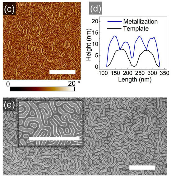 Shown in Figure 7a,b are SFM images of the striped template (with feature dimensions ~110 nm) and of the respective metalized pattern, exhibiting wires with ~50 widths. As visualized in the cross-section profile in Figure 7d, the striped pattern is multiplicated, revealing that the PVP block was likely covering the walls of the stripes, while the PS block was segregated to the middle of the initial stripes. This kind of segregation and of the topographic pattern is supported by SEM images in Figure 7e, where the light-gray stripes indicate the higher metal fraction. The bright contour lines, which highlight the light-gray stripes, are typically attributed to artifacts, caused by the surface topography [40]. However, in this case, the SEM image can be considered as a confirmation of a non-homogeneous distribution of the PVP component within the geometrical pattern, demonstrating a mismatch between the topographic and chemical pattern. A plausible explanation of the development of such complex microphase separation was derived from resolving the morphological development on a shorter timescale.