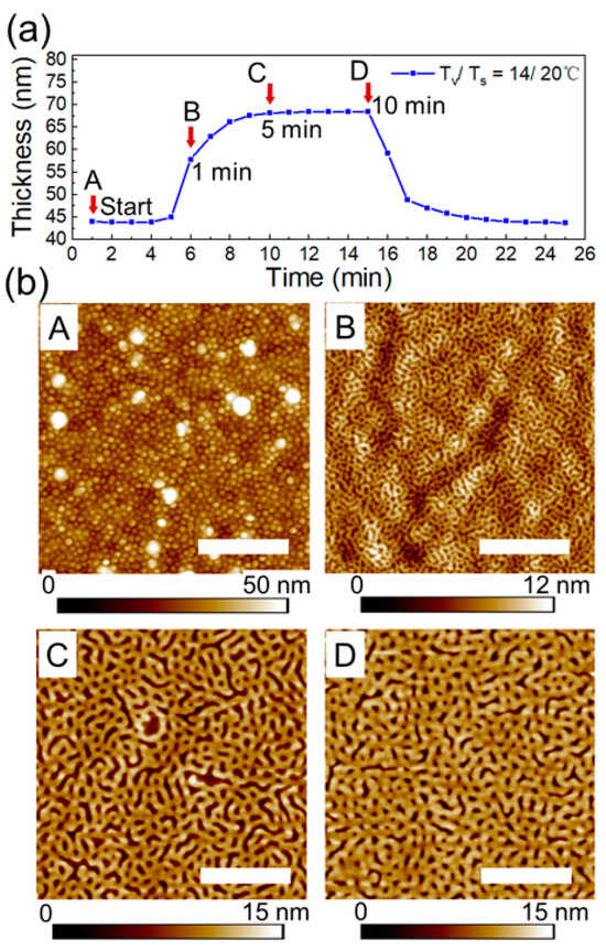 (a) Swelling kinetics of PS-PVP film annealed in 100% p/p0 chloroform vapors at Tv/Ts = 14/20 °C. A, B, C and D correspond to the topography imagies of the PS-PVP film in (b). Arrows indicate the indicated annealing duration. (b) SFM topography images A, B, C, D of the surface structures of spin-coated film and of the samples after 1 min, 5 min and 10 min of exposure to the solvent vapors. The white scale bar in each image corresponds to 1 μm.