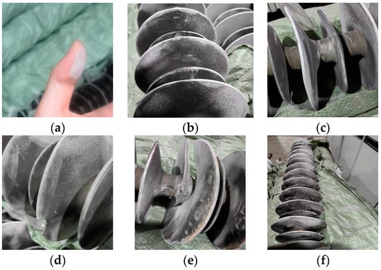Visual inspection of insulator shed: (a) surface chalking of insulators; (b) small cracks on the surface; (c) changes in insulator structure; (d) small cracks on the edge of the insulator shed; (e) insulator shed fracture; (f) half of the insulators are severely chalking, while the other half is heavily dirty.