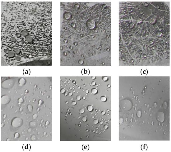 The chalking surface of the samples has only separated water droplets. Most of the water droplets have small retreat angles, which means the hydrophobicity of the aged chalking samples belongs to the HC1 level. After removing the powder from the sample, the retreat angle of the water droplets decreases, and most of the water droplets are no longer circular. The hydrophobicity of the de-powered surface of samples A and C belongs to the HC3 level, and the hydrophobicity of the de-pulverized surface of sample B belongs to the HC2 level.