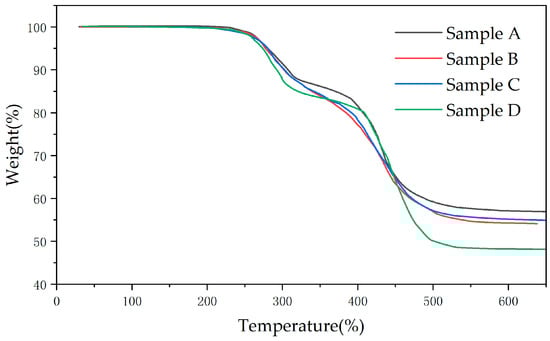 There are three main components in composite insulator sheds: PDMS, flame retardant Al(OH)3, and the reinforcing agent silica. As shown in Figure 4, the decomposition temperature of Al(OH)3 is the lowest, and it begins to dehydrate to produce alumina at about 230 °C, which is the first stage of weight loss. When the temperature is higher than 350 °C, the degradation of PDMS is the main degradation in SIR, which is the second stage of weight loss. Silica and other inorganic fillers are still difficult to degrade at high temperatures of 600 °C. Therefore, when the temperature exceeds 640 °C, only inorganic substances that are difficult to decompose are left in the sample, and the quality is almost no longer changed.