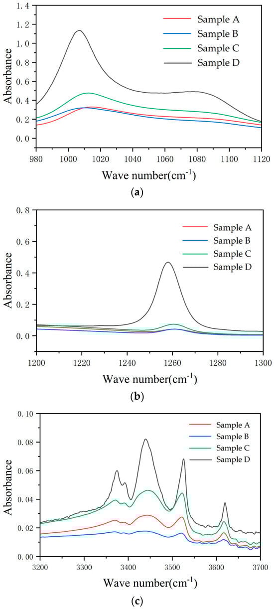 Infrared spectra of different samples: (a) the wave number is 1000–1200 cm−1, corresponding to the functional group of the main chain Si-O-Si; (b) the wave number is 1255–1270 cm−1, corresponding to the functional group of the C-H of side-chain Si-CH3; (c) the wave number is 3200–3700 cm−1, corresponding to the functional group of the -OH in filler ATH.