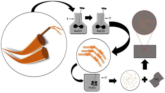 Cellulose nanofibers may have mechanical properties suitable for use with TPS. Additionally, cellulose nanofibers are materials of plant origin that are normally obtained from lignocellulosic plants [14]. Chemical treatment is the primary treatment for obtaining these materials, specifically through alkaline and acid hydrolysis treatments, which aim to remove some of the amorphous compounds present in the fibers [15].