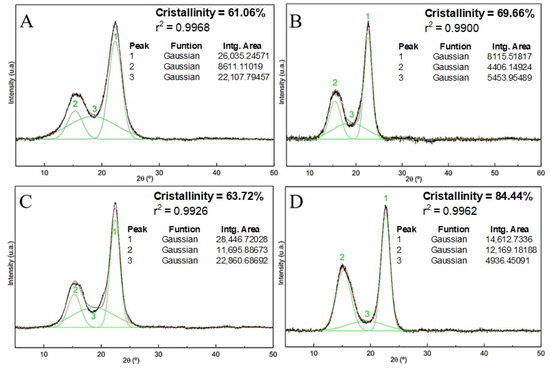 Figure 7 shows the results obtained by applying peak deconvolution to the diffraction patterns of untreated sisal fibers, sisal fibers with alkaline treatment, sisal fibers with alkaline and bleaching treatments, and nanofibers. For each analysis, the crystallinity indices (Ic), coefficients of determination (r2), and areas of the crystalline and amorphous peaks were highlighted. The crystallinity index of the untreated fiber (Figure 7A) was 61.06%, which is very close to the value found by Teodoro et al. [28], who obtained 60% crystallinity for sisal fibers. Ic values of approximately 60% were determined for crude fibers [36]. The crystallinity of the sisal fibers after alkaline treatment (Figure 7B) revealed that there was an increase in the crystallinity of the material relative to the raw fibers. These results reinforce the efficiency of the treatment that provides surface cleaning and removal of amorphous materials from the fibers. These results were corroborated by the IC calculation after alkaline treatment of the fibers: Curauá [46], Coccinia grandis. L. [47], Acacia planifrons bark [48], and jute [49].