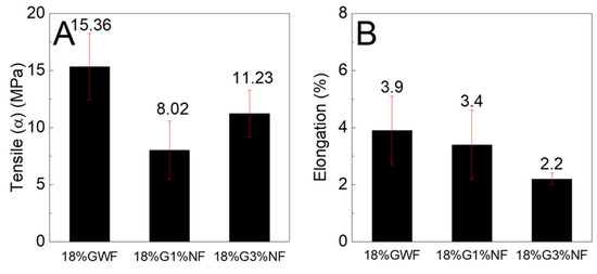 Figure 10 shows that the reference matrix of 28% GWF (film without nanofibers) presents a higher tensile stress than the films reinforced with nanofibers. There were no significant differences between the tensile stress results of the films reinforced with 1 and 3% nanofibers. According to the elongation results; there was an increase of approximately 25% in the films with 1% nanofibers and an increase of 20% for the films reinforced with 3% nanofibers. High elongation values are important for the food packaging sector to facilitate the handling and transportation of packages [12].