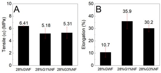In our study, we evaluated the effect of glycerol contents of 18, 28, and 36% and 1 and 3% of nanofibers on the tensile properties of nanocomposite films. Previous studies have indicated that nanofiber contents above 3% do not improve tensile properties [20]. The glycerol content generally used for starch plasticization is approximately 30% [12,14] Therefore, we decided to use glycerol amounts of 18, 28, and 36%. The mechanical tensile stress and elongation performance levels of the films with and without nanofibers and with variations in plasticizer concentration were evaluated.