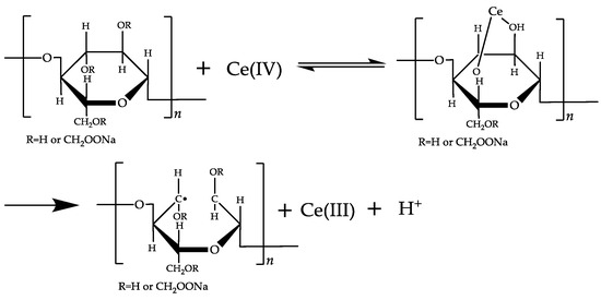 Using ceric ammonium nitrate [24] and potassium persulfate [25] to initiate monomer polymerization reactions, the main reactions are depicted in Figure 3.