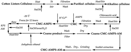 The cotton linters were shredded, dried, and alkalized to obtain refined cellulose, which was then etherified with chloroacetic acid to produce carboxymethyl cellulose (CMC). Then, 2 g of CMC and 0.125 mmol/L cerium ammonium nitrate solution (relative to a liquid volume of 50 mL of the reactant) were taken and the pH was adjusted to 1.0. The solution was placed in a constant temperature water bath at 50 °C and stirred for 15 min. 2-acrylamido-2-methylpropanesulfonic acid (AMPS) was slowly added to this solution, and a reaction was maintained for 4.5 h. Then, sodium hydroxide and urea were added to form a stable NaOH/Urea/H2O solution system (with mass fractions of 7% NaOH, 12% urea, and 81% water). The solution was frozen at −12 °C for 12 h. It was then thawed and heated to 50 °C while stirring. Potassium persulfate (KPS) and acrylamide (AM) were slowly added and reacted for 4.5 h. After the reaction, the crude CMC-AMPS-AM copolymer was precipitated and dried in double the amount of ethanol, followed by grinding. Using ethanol and acetone as solvents, pure CMC-AMPS-AM copolymer was obtained after 48 h through extraction with a Soxhlet apparatus. The preparation process is shown in Figure 4.