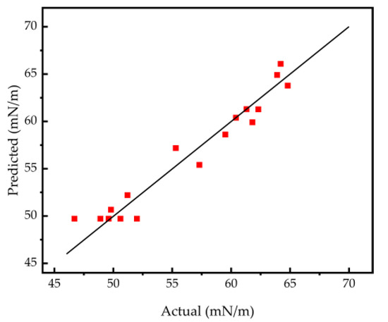 The p value for the lack-of-fit term is 0.2205, which is greater than 0.05, suggesting that the lack-of-fit is not statistically significant [26]. Figure 5 depicts the correlation between the factual surface tension and the anticipated surface tension. The proximity in the correspondence between the projected quantities and the actual quantities signifies an elevated level of concordance between them. In this manner, it showcases the dependability of the quadratic response regression model [27].