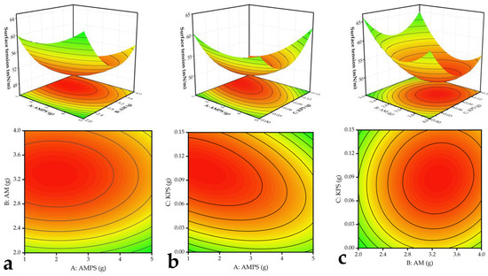 Figure 6. (a) Effect of AMPS input and AM input on dispersant surface tension. (b) Effect of AMPS input and KPS input on surface tension of dispersant. (c) Effect of AMPS input and KPS input on surface tension of dispersant.