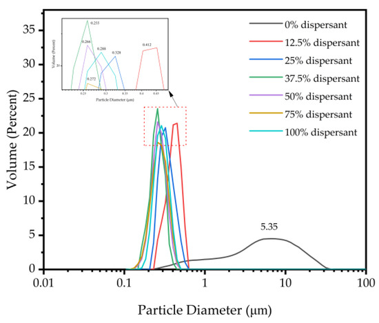 Figure 7. Particle size distribution of dispersed carbon black with different dispersant concentrations.