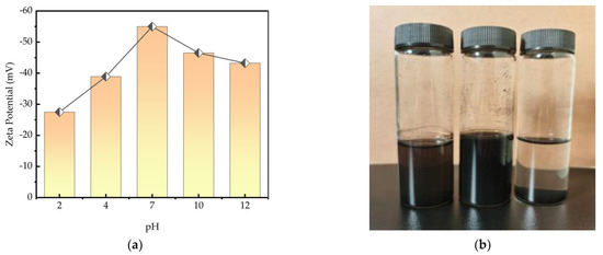 Figure 8. (a) Zeta–pH curves of carbon black and CMC-AMPS-AM. (b) Addition of 37.5% dispersant to carbon black at different pH (right pH = 12, middle pH = 7, and left pH = 2). Natural settling effect can be seen for the right vial with high pH.