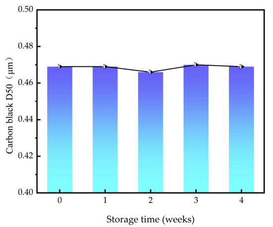 After undergoing mechanical fracturing and abrasion with the ball mill, the particle size of carbon black decreases while the surface energy increases. This results in an elevated adhesion force between different particles that results in particle agglomeration. Hence, the stability of dispersants holds utmost significance [34,35]. In reference to Section 3.3.1 for preparing the slurry, add 10% dispersant to the carbon black, then ball mill the sample and store at room temperature. The variation in particle size is monitored every seven days. As shown in Figure 9, the particle size of the carbon black exhibits minimal fluctuation, remaining within the range of 0.469 μm before storage to 0.474 μm at the end of the fourth week. Facilitated by the dispersant, the carbon black particles surmount inter-particle adhesion as well as electrostatic forces, displaying no discernible trend of "coarsening". This suggests the dispersant confers commendable dispersion stability.